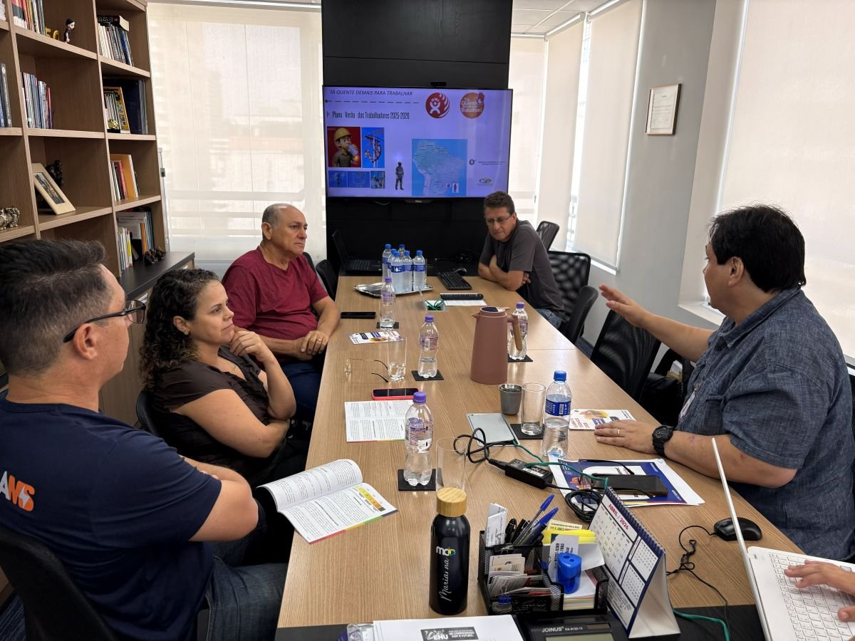 Na última quinta-feira, 23 de abril, o presidente, a diretora de finanças e o diretor de base de Ponta Porã do Sinergia‑MS, Chico Ferreira, Aliceia Araújo e Carlos Eduardo Justino, respectivamente, estiveram na capital paulista para uma reunião estratégica com o presidente do Sindicato dos Eletricitários de São Paulo, Eduardo Annunciato (Chicão), e o engenheiro de Segurança do Trabalho, Antônio Moreira, com o objetivo de conhecer detalhadamente o 1º Plano Verão, projeto pioneiro que busca enfrentar os riscos do calor extremo na rotina dos eletricitários.