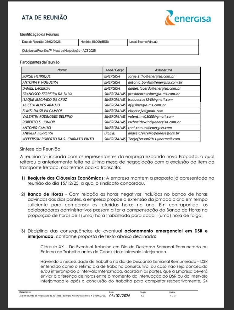 O Sinergia-MS reprovou a proposta ainda na mesa por entender que ela escancara o descompromisso da empresa com a saúde e a segurança dos trabalhadores, apesar do discurso repetido por diretores e gestores. Na prática, o que a Energisa busca é aumentar a carga de trabalho dos eletricistas, intensificar jornadas e elevar o risco de fadiga, adoecimento e acidentes, em um setor onde o erro pode significar risco de morte. Além disso, a proposta revela uma tentativa clara de abrir caminho para encerrar no Judiciário as inúmeras ações trabalhistas que a empresa responde exatamente pelo descumprimento do DSR e do intervalo interjornada.